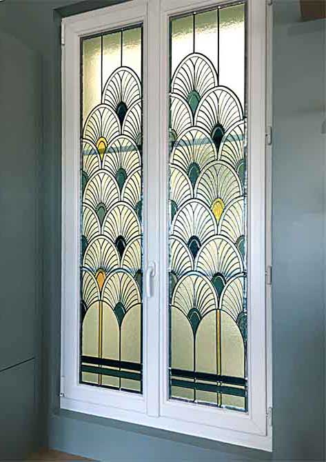 Motif "ÉVENTAIL" ADC-35 Plomb "Antique" et "Brass" (vieil or) : voir détail Réalisation sur verre "SAHARA" ep. 4mm Montage sur double vitrage existant