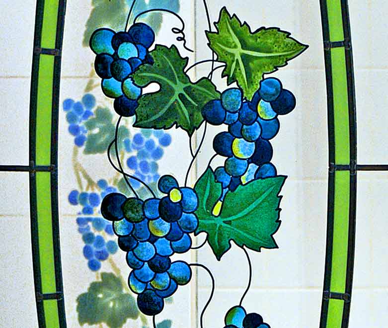 détail films de couleur et cerne noir avec reprise en peinture sur verre ( motif original sur céramique visible par transparence à l'arrière plan )