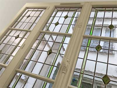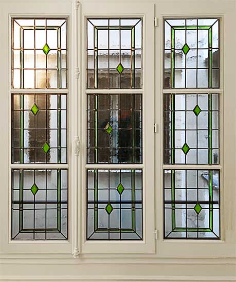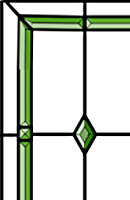 MOTIF géométrique "RECTANGLE" avec cabochons LSG - Bordure périphérique "PENCILS" Réalisation en plomb 1 face sur verre Nature Cristal - Montage sur doubles vitrages existants