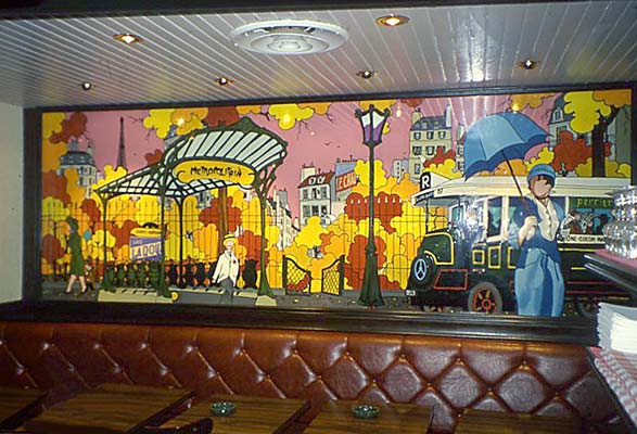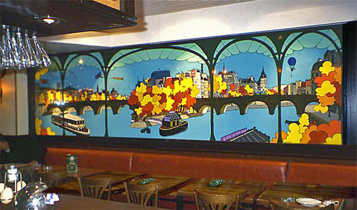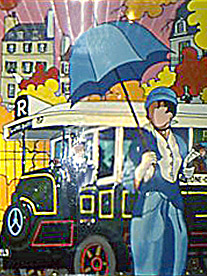 MOTIF : paysage Paris style naïf - vernis couleur cerné noir Réalisation sur verre feuilleté "STADIP" 44.2 Opale ép. 8mm Montage dans cadre caisson lumineux - Éclairage arrière néon