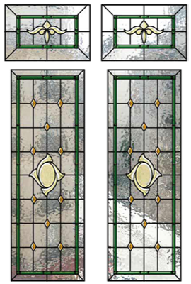 Composition de bevels " SB17 " gauche et droite sur maillage " CASTEL " avec cabochons LOSANGE IMPOSTE avec bevel " OS12 " BORDURE " PENCIL " ( barrettes de verre biseauté ) largeur 25mm Réalisation sur verre SAHARA ep. 4mm - Montage sur double vitrage existant par collage silicone