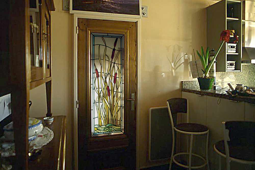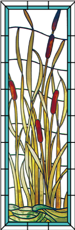 MOTIF Nature " ROSEAU " sur maillage de base " VAGUE " BORDURE " CI " ( galon couleur en retrait ) Réalisation sur verre NATURE CRISTAL ep.4mm - Montage sous baguettes