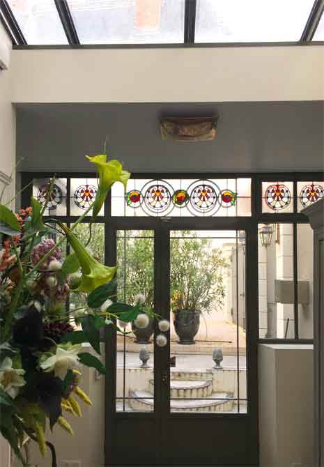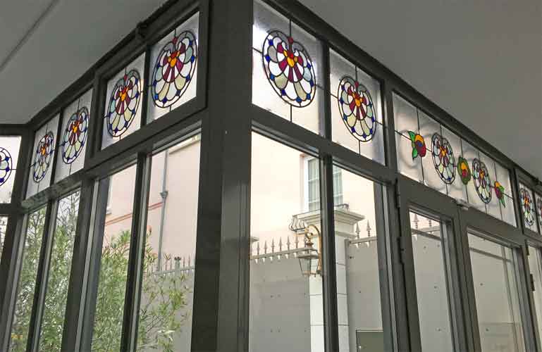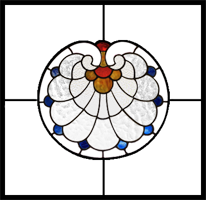 MOTIF médaillon " Coquille " Art Nouveau Réalisation sur verre " Nature Cristal " ep. 4mm - Montage par collage silicone sur double vitrage existant ( Villa Andresy - Yvelines )