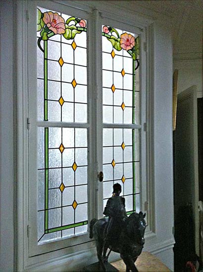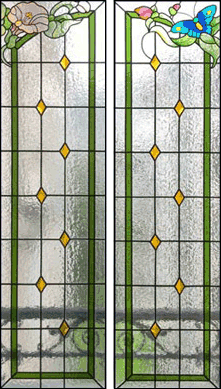 MOTIFS : " INSERTS " INS - 10 " et " INS - 11 " BORDURE "PENCIL" ( barrettes de verre biseauté rapportées par collage UV ) Réalisation sur verre SAHARA ep. 4mm - Montage classique sous baguettes