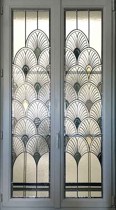 Motif "ÉVENTAIL" ADC-35 Plomb "Antique" et "Brass" (vieil or) : voir détail Réalisation sur verre "SAHARA" ep. 4mm Montage sur double vitrage existant