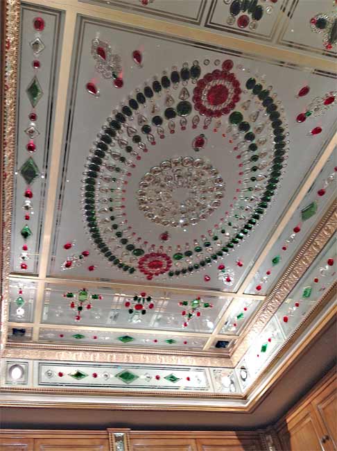 Composition de bevels et cabochons rapportés par collage UV sur miroirs sablés