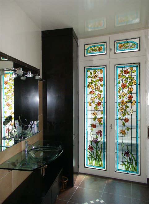 BORDURE "PENCIL" ( barrettes de verre biseauté largeur 25mm ) Réalisation sur verre SAHARA ep.4mm - Montage par collage silicone sur double vitrage existant RETROUVEZ CE MOTIF VIA LA GALERIE DANS LES PAGES : |