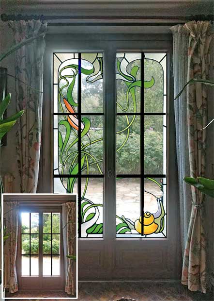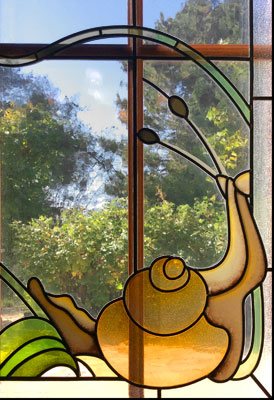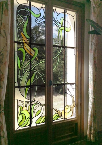 MOTIF : Art Nouveau " L'Escargot " ANV-33 Réalisation sur verre Nature Cristal ep. 4mm Montage par collage silicone sur doubles vitrages existants