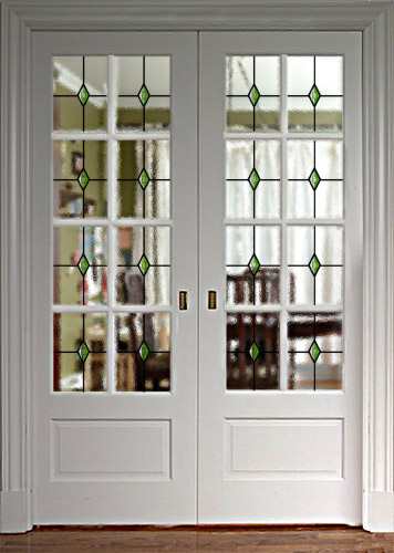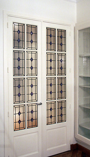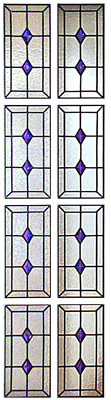À gauche ( PINT-03 ) : motif multicarreaux " MTC-04D " avec doubles cabochons losange " LSG " - BORDURE "S" ( 1 filet de plomb en retrait )