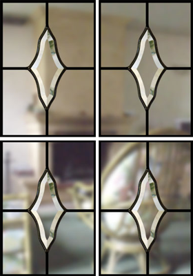 MOTIF multicarreaux " MTC-31 " avec bevels simples " PGD " Réalisation sur verre NATURE CRISTAL ep. 4mm - Montage classique sous baguettes