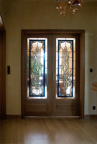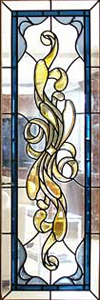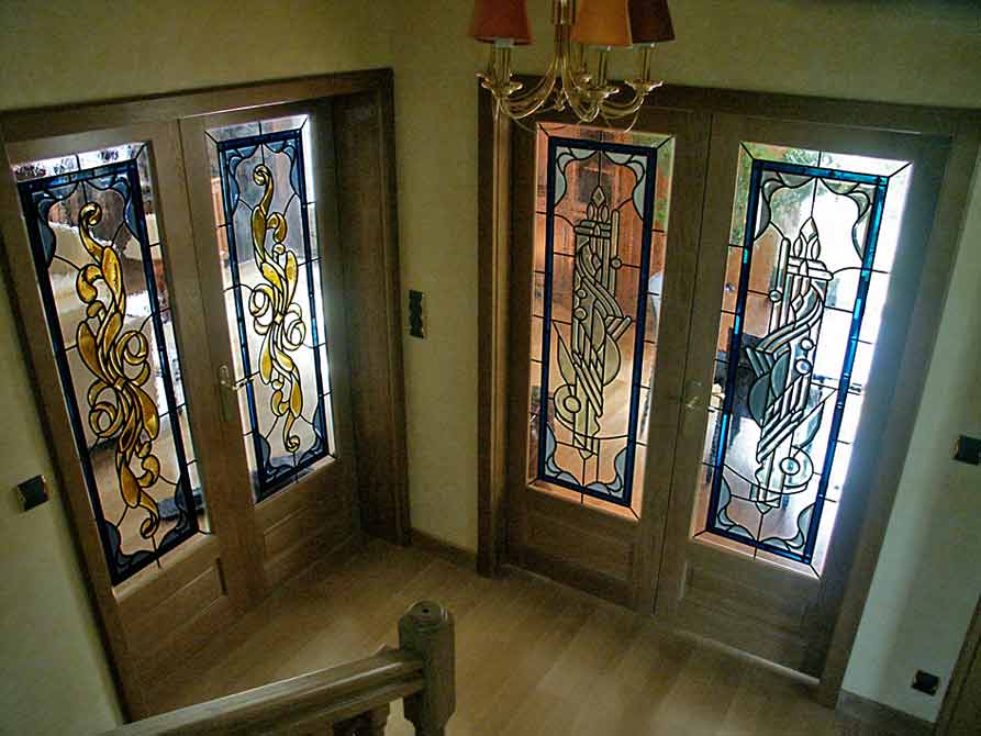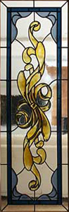 MOTIF : ensemble bevels ABSTRAIT " XA-CL02 " et XL-HCC21 (photo de droite) BORDURE " PENCIL " ( barrettes de verre biseauté ) largeur 25 mm avec angles ornés " AGLO-327 " Réalisation sur verre Nature Cristal ep. 4mm - Montage classique sous baguettes ( Villa Ile-de-France )