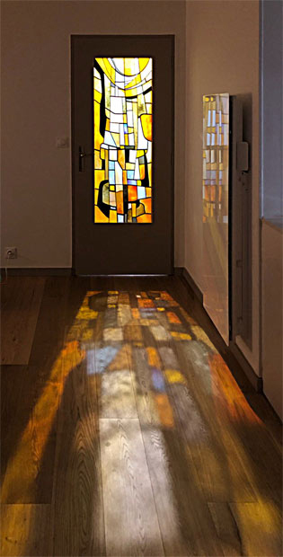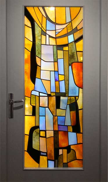 MOTIF : Abstrait " ABST-25 " films couleur adhésifs avec plombs de différentes largeurs Réalisation sur verre Nature Cristal ep. 4mm