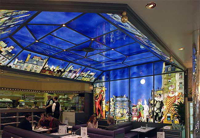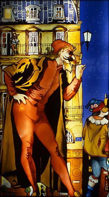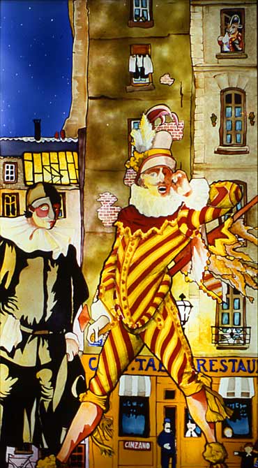MOTIF " LE CARNAVAL " vernis couleur cerné noir Réalisation sur verre feuilleté opale 44.2 éclairage arrière par néon ( La Tour du Temple - Paris ) |